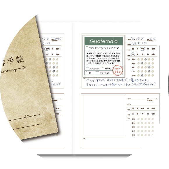 毎月、世界各国から厳選したコーヒーを、おすすめの焙煎方法でお届けします。思いがけない味わいや新しい飲み方を発見したら、同梱の「珈琲手帖」に記録しましょう。”探検先”が増えるたびに、あなたのコーヒーの世界が広がり、そこからきっと「好みのコーヒー」が見つかります。