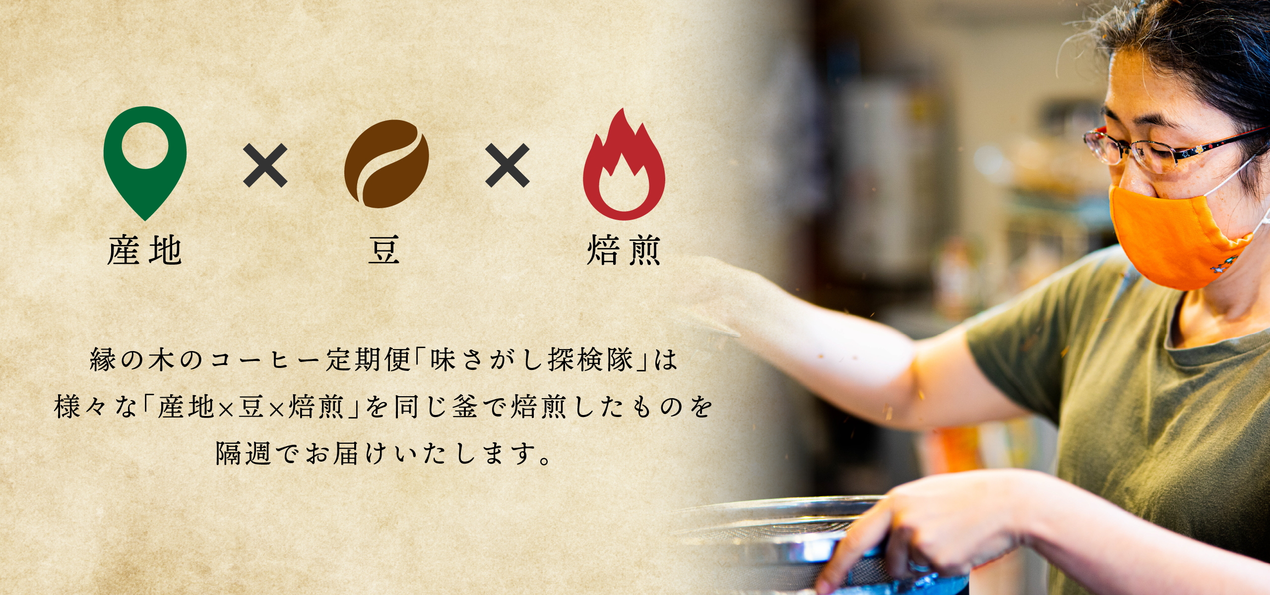 なんとなくコーヒーを選んで飲んでいても、どんなコーヒーが好きなのか、迷子になってはいませんか?縁の木のコーヒー定期便「味さがし探検隊」なら、様々な「産地×豆×焙煎」を同じ釜で焙煎するので、新しい出会いを楽しみながら、味の違いをしっかりと飲み比べることができます。